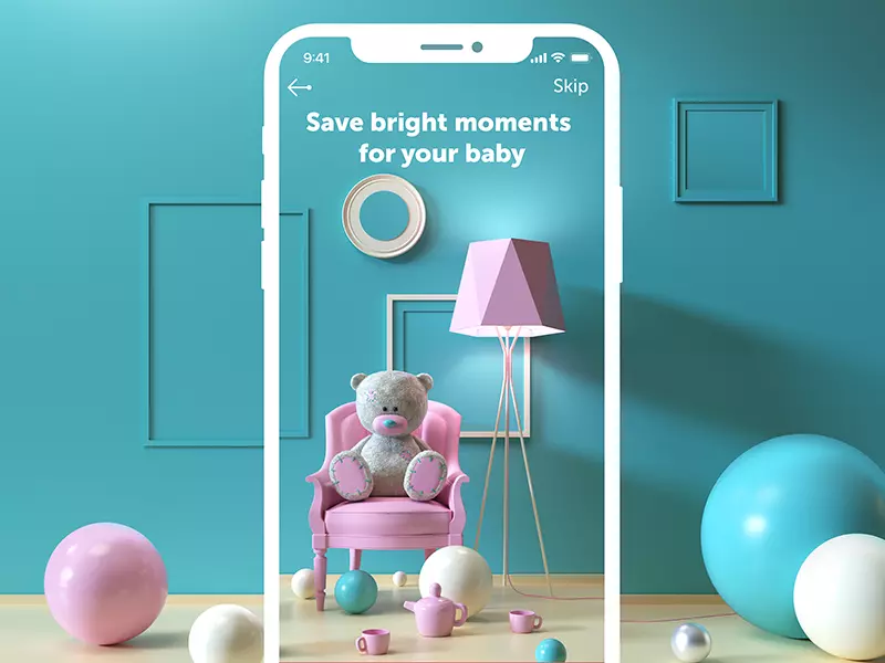 The onboarding of an app for parent’s diary by Tubik applies 3D graphics to make the screen cute and atmospheric.